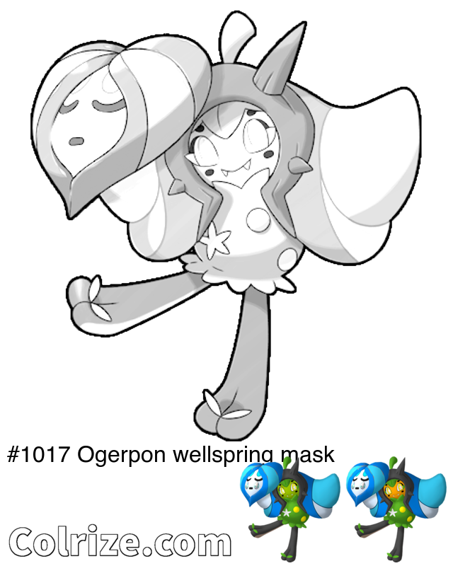 Ogerpon wellspring mask pokemon coloring page with color references! Also has Shiny Ogerpon wellspring mask