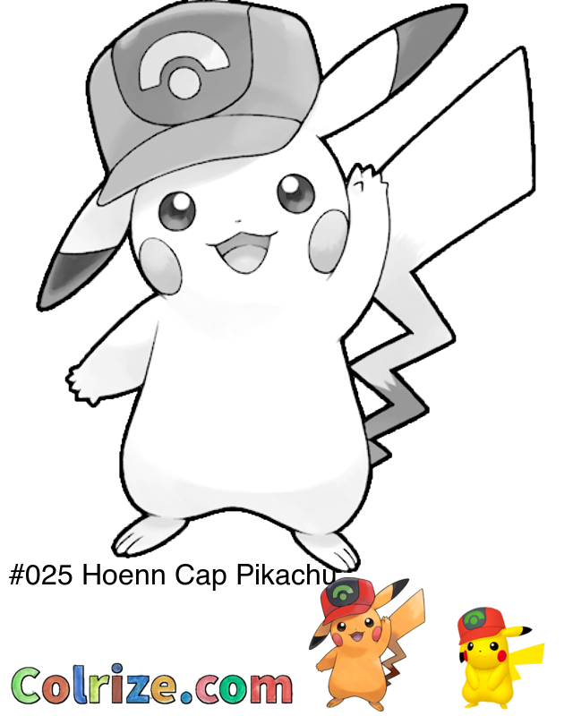 Hoenn Cap Pikachu pokemon coloring page with color references! Also has Shiny Hoenn Cap Pikachu and evolution chain coloring pages