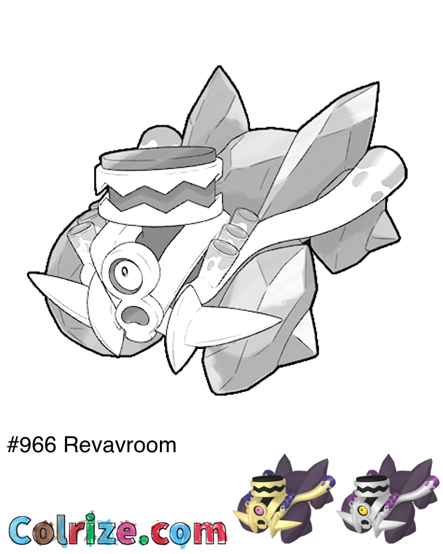 Revavroom pokemon coloring page with color references! Also has Shiny Revavroom and evolution chain coloring pages