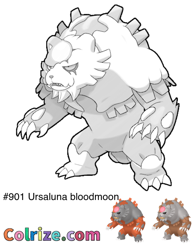 Ursaluna bloodmoon pokemon coloring page with color references! Also has Shiny Ursaluna bloodmoon and evolution chain coloring pages